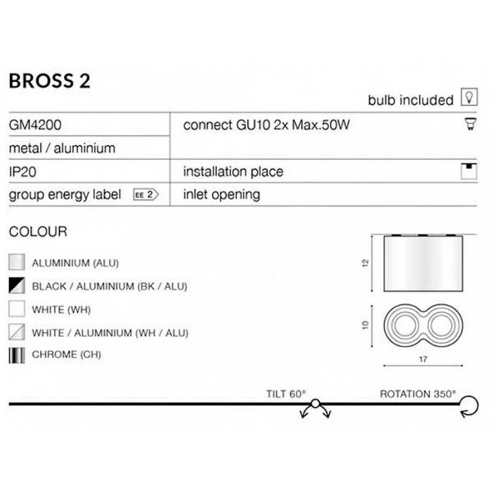 Товары фабрики Azzardo можно подобрать в интернет магазине светильников mir-sveta.kiev.ua. Светильник серии Bross имеет лаконичный дизайн, такой световой прибор подходит в кафе и рестораны, в офис, а также для помещений в стиле современный,_x000D_ модерн,_x000D_ хай-тек. Количество лампочек в изделии - 2шт, мощностью 50Вт, цоколь типа GU10.Azzardo Bross (gm4200-bk-bk) выполнен из качественных материалов: алюминий, металл.