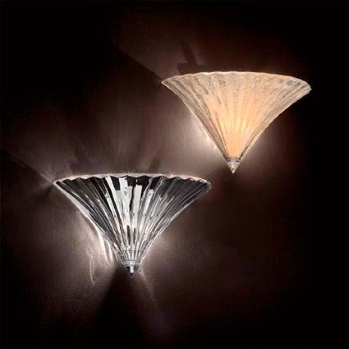 Люстра з прозорого дутого скла ручної роботи. Деталі з металу в хромі. Ланцюг прихована оксамитовою тканиною. Бра доступні також в залотістом вигляді з гранульованим склом.