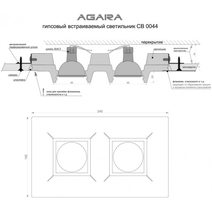 Світлові прилади заводу Agara можна вибрати в інтернет магазині світильників Світ Світу. Точковий світильник серії CB має лаконічний дизайн, такий варіант купують на кухню, в передпокій, а також для приміщень в стилі модерн. Кількість ламп у виробі - 2шт, потужністю 35Вт, цоколь типу GU5.3.Точковий світильник Agara 01210W CB 0044 проведений з надійних компонентів: гіпс.