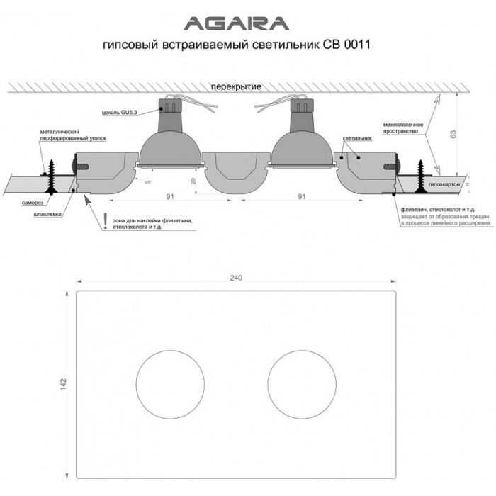 Вироби заводу Agara можна купити в магазині Світ Світу. Точковий світильник серії CB має гарне співвідношення ціна-якість, такий світловий прилад встановлюють в передпокій, на кухню, а також для приміщень в стилі модерн. Лампочок в приладі - 2шт, потужністю 35Вт, цоколь типу GU5.3.Точковий світильник Agara 01206W CB 0011 складається з надійних матеріалів: гіпс.