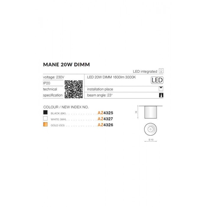 Вироби фабрики Azzardo можна замовити online у Світ Світу. Точковий світильник серії MANE має оригінальний вигляд, такий виріб вибирають для офісу, для вітальні, а також для приміщень у стилі лофт. Кількість джерел світла у світловому приладі – 1шт, потужністю 20Вт, цоколь типу LED module. Світловий потік становить - 1600. Колірна температура - 3000.Точковий світильник Azzardo AZ4326 Mane виготовлений з екологічних складових: метал, алюміній.