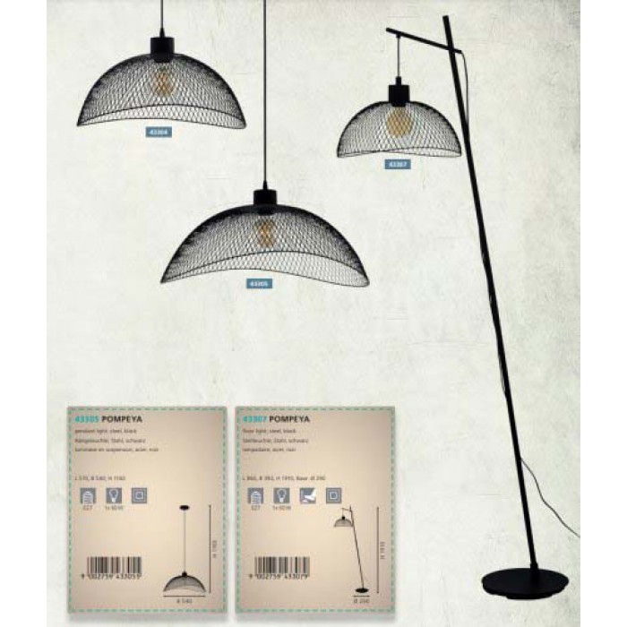 Продукцію заводу Eglo можна замовити у магазині освітлення Світ Світла. Люстра серії POMPEYA має лаконічний дизайн, такий світловий прилад встановлюють кабінет, кухню, а також для приміщень у стилі лофт, вінтаж. Джерел світла у світловому приладі - 1шт, потужністю 60Вт, цоколь типу E27.Люстра Eglo 43305 Pompeya виконана з довговічних компонентів: метал.