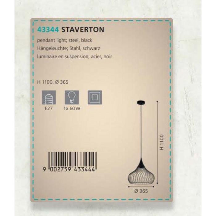 Світильники бренду Eglo можна обрати в інтернет магазині світильників mir-sveta.kiev.ua. Люстра серії Staverton має нестандартний вигляд, таку модель купують кабінет, кухню, а також для приміщень у стилі вінтаж, етнічний. Лампочок у світловому приладі - 1шт, потужністю 60Вт, цоколь типу E27.Люстра Eglo 43344 Staverton виконана із сучасних матеріалів: метал.
