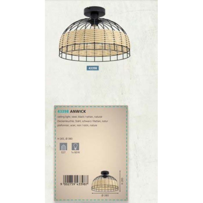 Світильники виробника Eglo можна замовити у магазині світильників Світ Світла. Люстра серії ANWICK має нестандартний вигляд, такий варіант оформляють коридор, вітальню, а також для приміщень у стилі лофт, вінтаж, етнічний. Кількість ламп у світловому приладі – 1шт, потужністю 60Вт, цоколь типу E27.Люстра Eglo 43398 Anwick сконструйована із сучасних компонентів: метал, ротанг.
